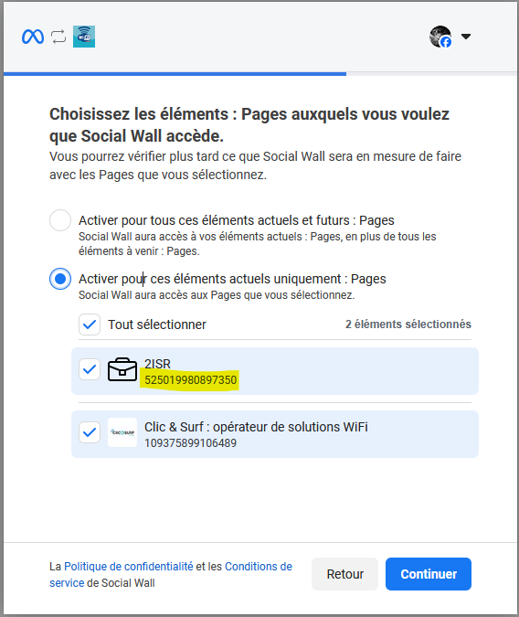 Sélectionnez la page ou vous souhaitez nous donner l'accès en lecture