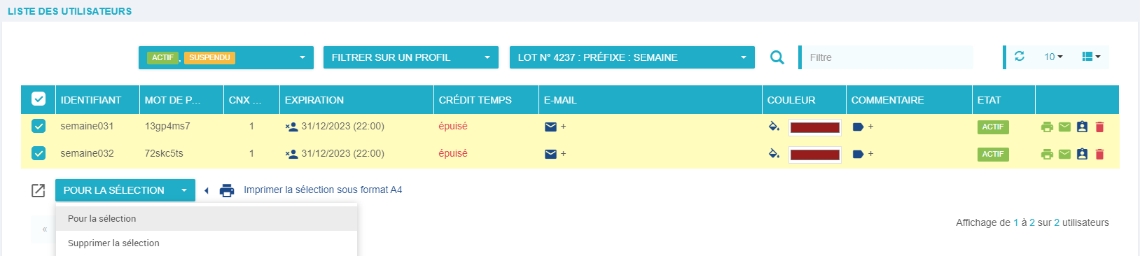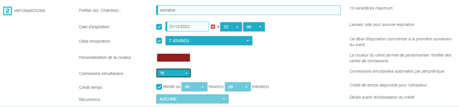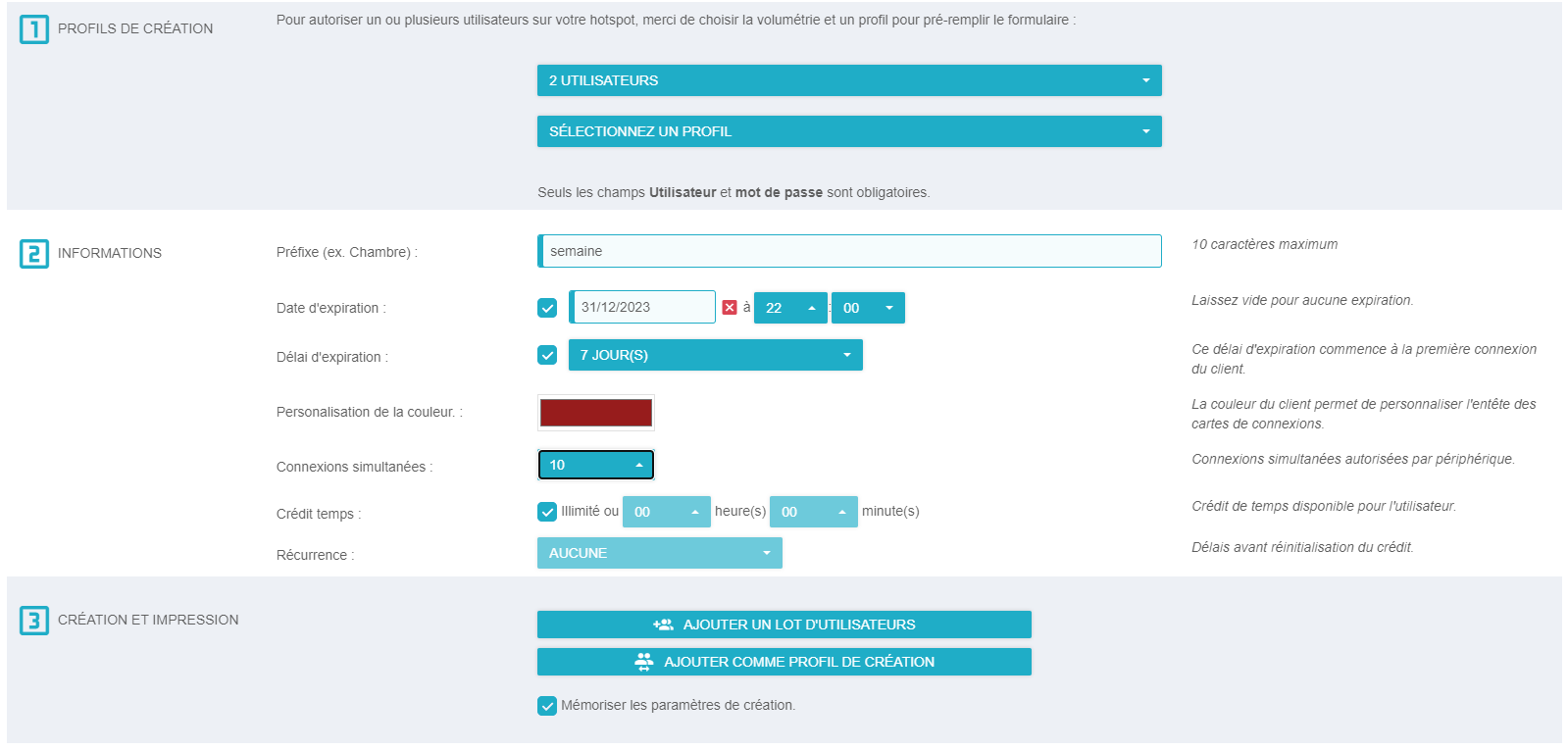 Un préfixe : Le préfixe est utilisé pour créer un lot d'utilisateur (minimum 2). Par exemple, avec le préfixe semaine, les utilisateurs créés seront semaine001, semaine002…