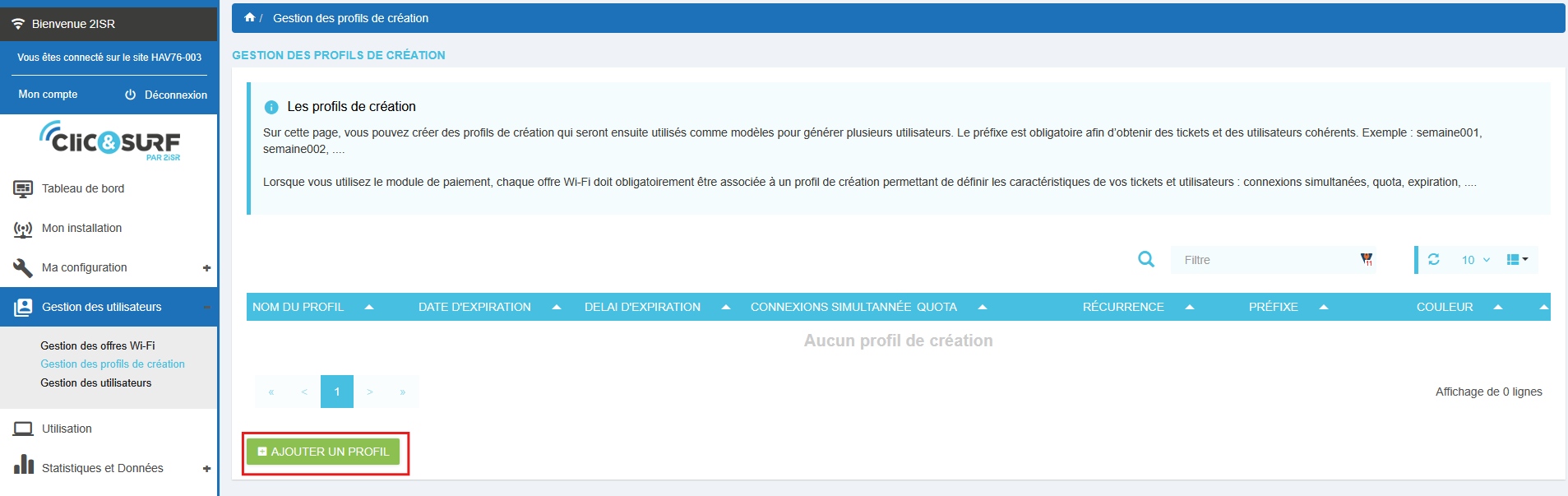 Pour commencer à créer un profil personnalisé, il faut se rendre sur la page, Gestion des utilisateurs > Gestion des profils de création et cliquer sur le bouton ajouter en bas de la page.