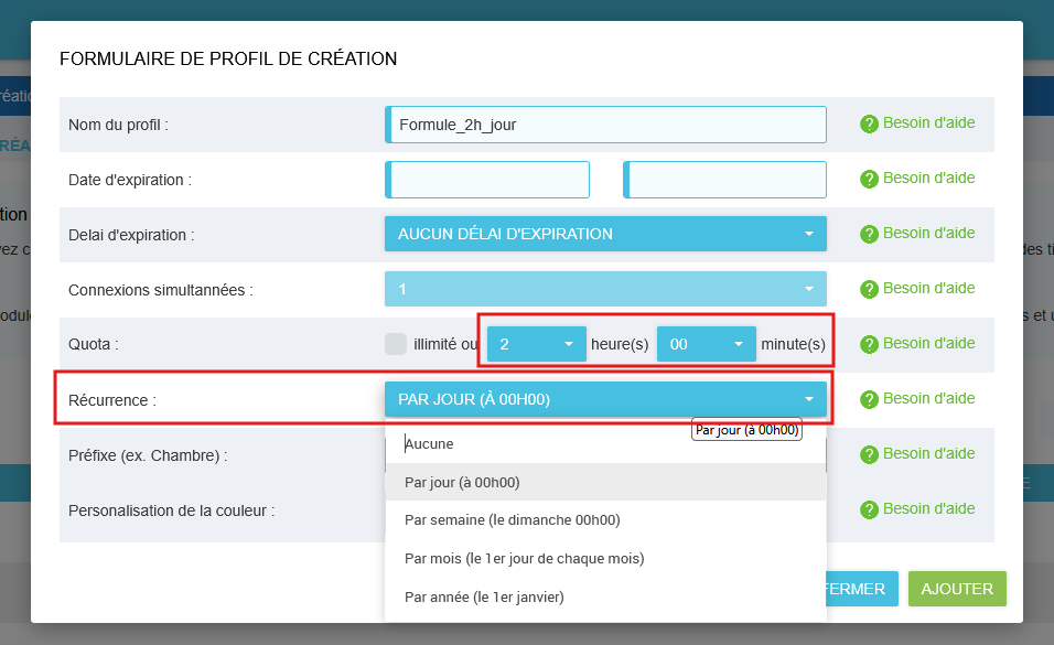 Récurrence (facultatif) : Ce paramètre permet de réinitialiser le ticket régulièrement. Par exemple, pour un ticket récurrent de 2 h par jour, l'utilisateur verra son crédit réinitialiser chaque jour à minuit. Plusieurs récurrences sont proposées (jour, semaine, mois, année).
