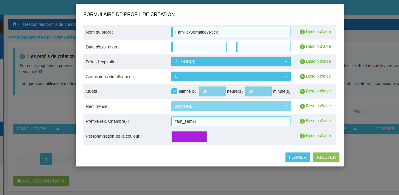 Préfixe (obligatoire) : Ce paramètre est utilisé pour identifier vos tickets dans le tableau de gestion des utilisateurs Par exemple, avec le préfixe fam_sem7j, les utilisateurs créés seront fam_sem7j_001, fam_sem7j_002…