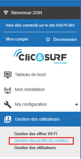 Pour accéder à cette fonctionnalité, il faut se connecter sur l'extranet et cliquez sur Gestion des utilisateurs > Gestion des profils de création.