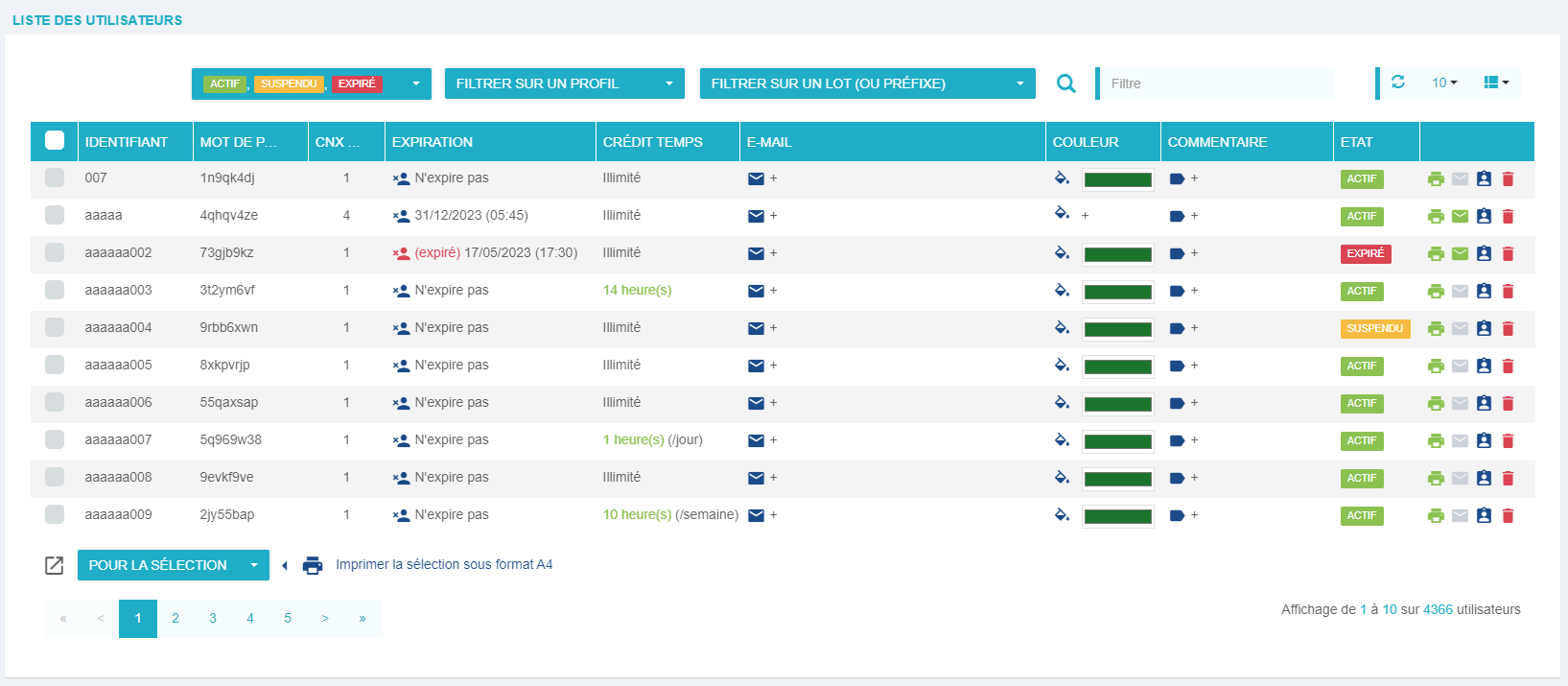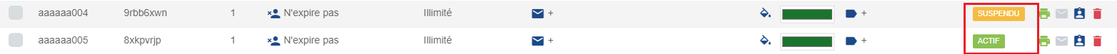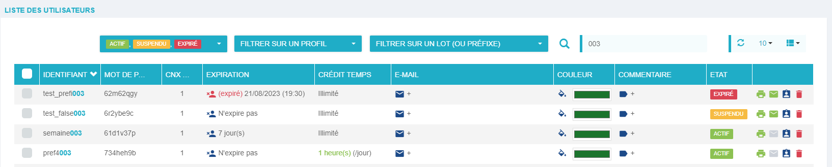 EXPIRATION : cliquer sur l'expiration pour afficher une fenêtre qui permettra de modifier la date ou la valeur du délai d'expiration. Si un utilisateur est expiré et que sa date ou son délai est actualisé, il devient ACTIF.