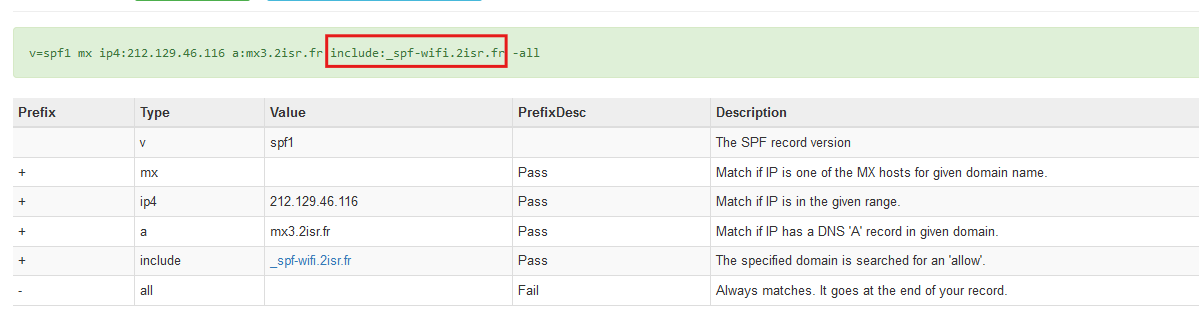 Vous devriez obtenir une ligne contenant include:_spf-wifi.2isr.fr. Si c'est le cas votre modification est conforme et prise en compte