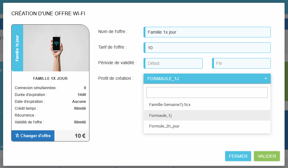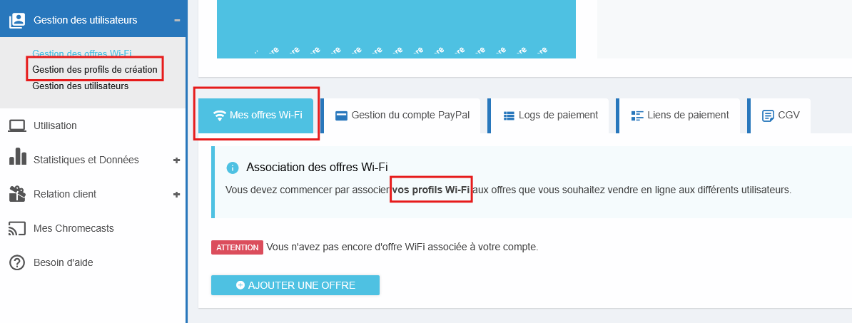 Il est important de noter qu'une offre WiFi est forcément associée à un profil de création. Vous devez commencer par créer vos profils si cela n'est pas encore fait.