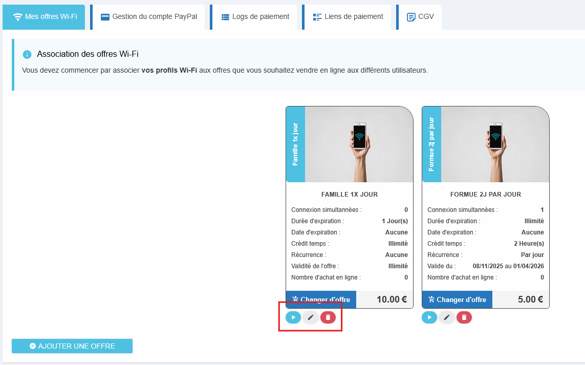 Pour créer une offre Wi-Fi il suffit d'accéder à l'onglet Mes offres Wi-Fi puis de cliquer sur Ajouter une offre.
