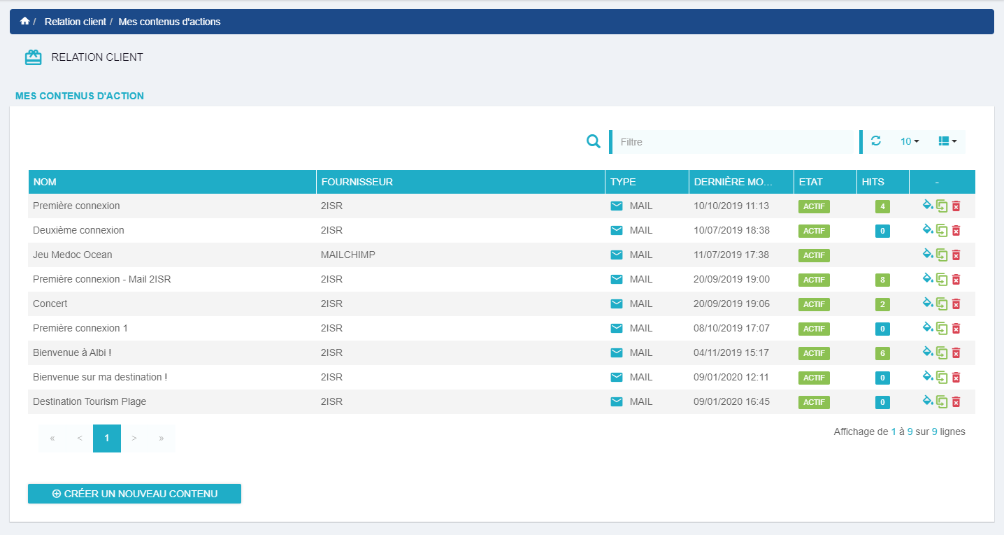 Pour créer un nouveau contenu de type MAIL qui sera utilisé par un scénario de relation client, rendez-vous dans le menu à gauche Relation client puis dans le sous-menu Mes contenus d'actions.