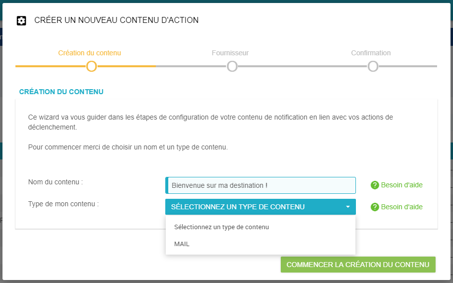 Les étapes de l'assistant vous permettrons de créer le contenu en fournissant les informations suivantes :