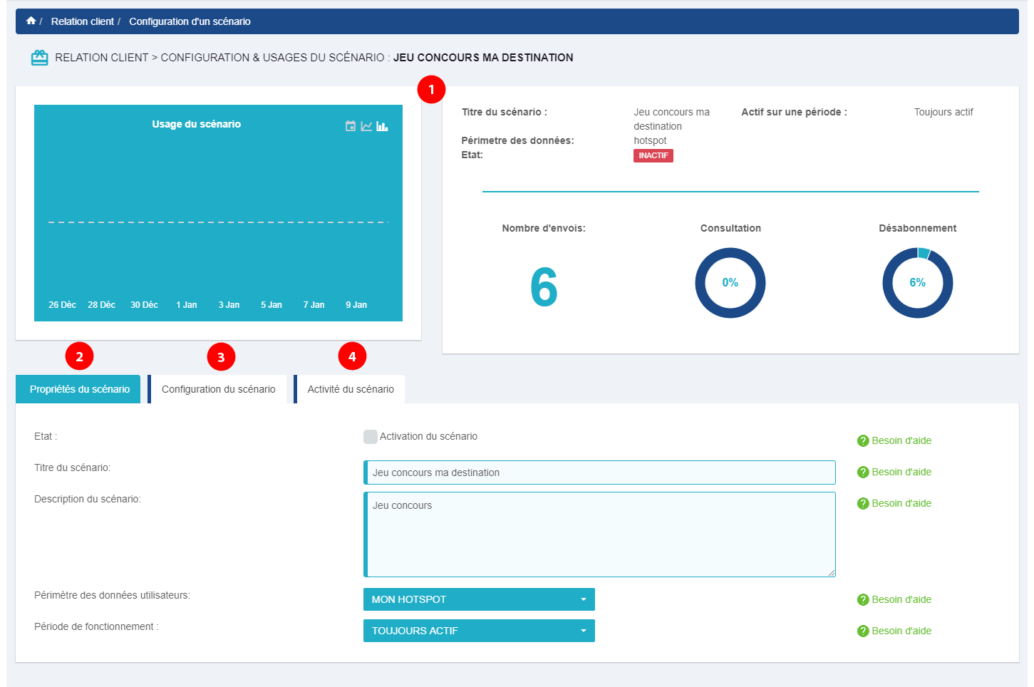 Cet onglet vous permet à visualiser l'activité du scénario et les actions réalisées par ce dernier ainsi que les destinataires de votre communication.