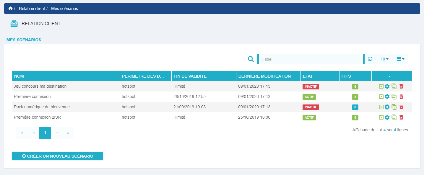 Pour créer un nouveau scénario, rendez-vous dans le menu à gauche Relation client puis dans le sous-menu Mes scénarios.
