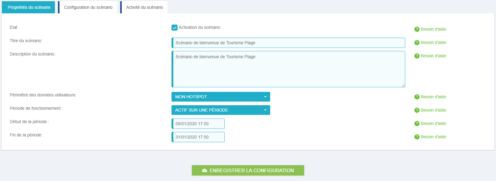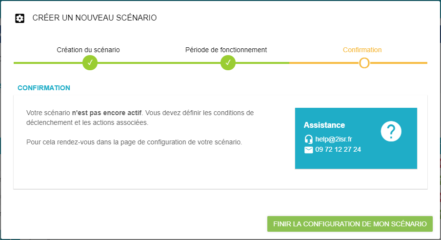A ce stade, le scénario est créé, la suite de la configuration se fait via le bouton FINIR LA CONFIGURATION DE MON SCENARIO