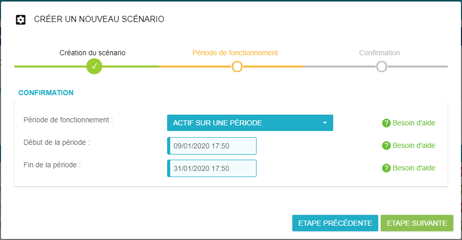 Les étapes de l'assistant vous permettrons de créer le scénario en fournissant les informations suivantes :