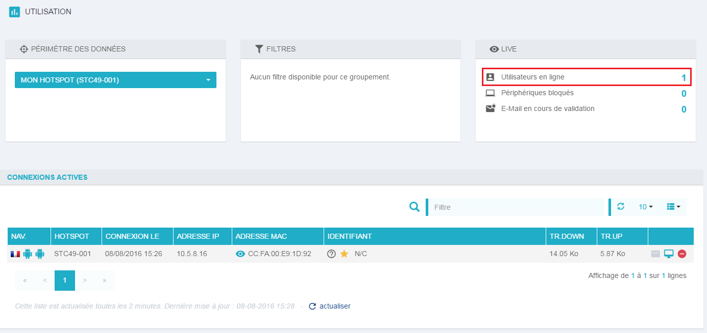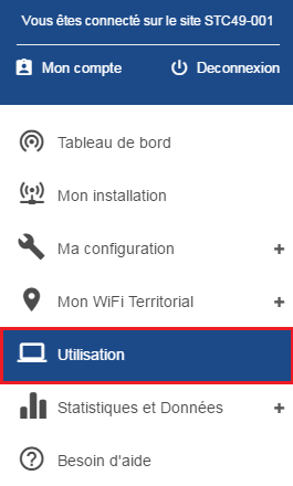 Vous souhaitez voir le nombre d'utilisateurs connectés en temps réel sur le système wifi. Rendez-vous dans le menu Utilisation à gauche